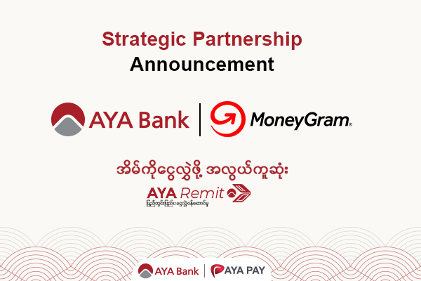 Ayeyarwady Bank Public Company Limited (“AYA Bank”), a leading private commercial bank in Myanmar, announced a strategic partnership with MoneyGram, a leading global payments network for consumers, businesses and communities, to offer reliable, fast and convenient international money transfers to Myanmar.